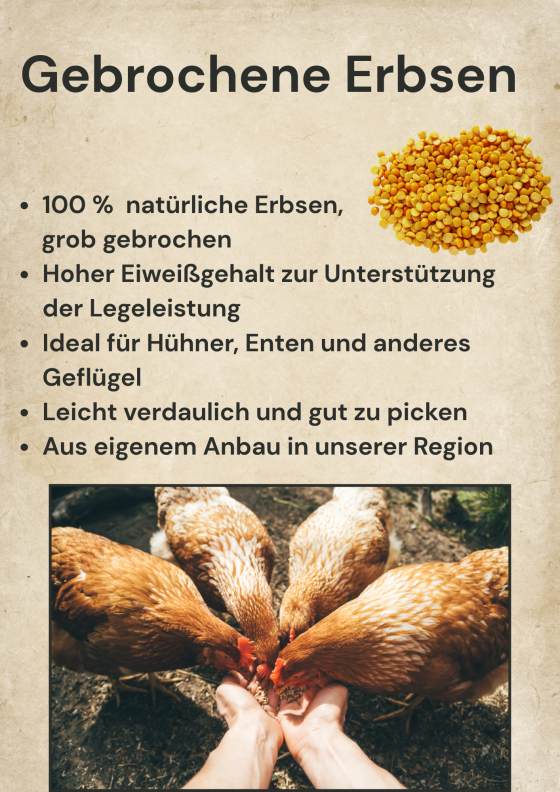 Unsere gebrochenen Erbsen sind ein hochwertiges Einzelfuttermittel für Hühner, Enten, Gänse und anderes Geflügel. Sie stammen aus Regionalem Anbau und werden schonend verarbeitet, um ihre natürlichen Nährstoffe zu erhalten. Die Erbsen sind grob gebrochen und daher besonders leicht verdaulich – ideal zur Ergänzung der täglichen Futterration.
